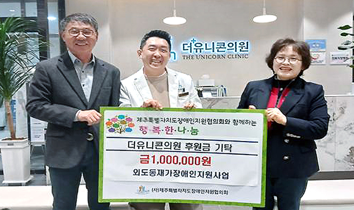더유니콘의원(원장 김규진)은 지난 9일 (사)제주특별자치도장애인지원협의회(회장 양영철)를 통해 외도동장애인지원협의회(회장 강현주)에 재가장애인 지원을 위한 후원금 100만원을 전달했다.