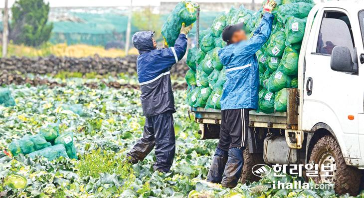 [한라일보] 봄비가 내린 14일 제주시 한림읍 수원리의 한 농경지에서 농민들이 비를 맞으며 양배추 수확 작업을 하고 있다.