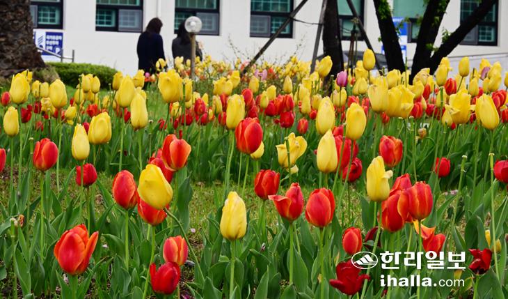 [한라일보] 봄비가 내린 14일 제주시 연동 제주도의회 정원에 튤립이 만개해 눈길을 끌고 있다.