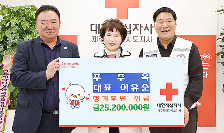 [한라일보] 푸주옥 오라점 이유순 대표는 최근 대한적십자사 제주특별자치도지사(회장 정태근)에 방문해 정기후원 성금 2520만원을 전달했다.
