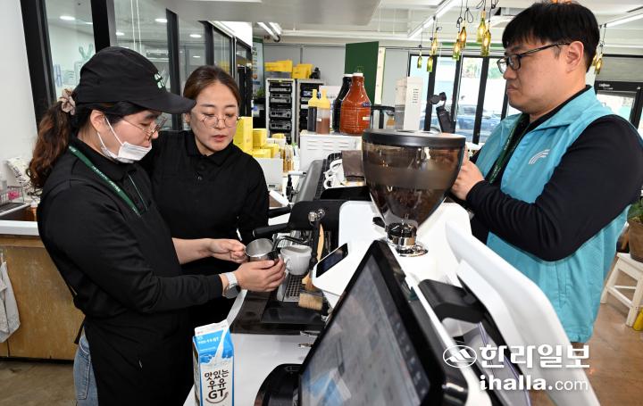 오민서(26, 왼쪽)씨는 카페와 베이킹을 전담한다. 오래 전부터 바리스타를 꿈꿔 온 그가 가장 자신있는 메뉴는 ‘커피’다. 반대편에선 박세원(47, 오른쪽)씨가 영상을 촬영하고 있다. 강희만기자