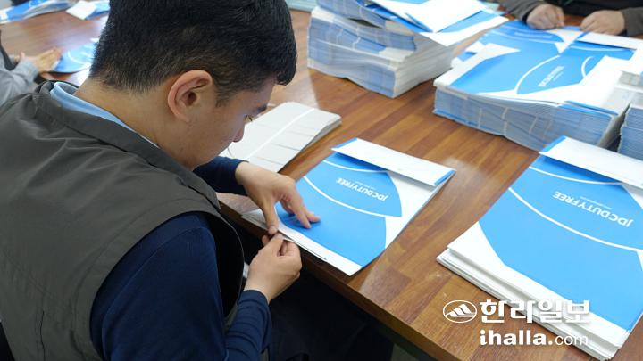 희망나래일터에서 근무하는 발달장애인 노동자가 제주국제자유도시개발센터(JDC) 면세점 쇼핑백을 반듯하게 접고 있다. 양유리기자