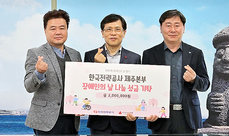한국전력공사 제주본부(본부장 박득원·지부위원장 정재규)는 22일 제46회 장애인의 날을 맞아 지역 내 장애인을 지원하기 위해 임직원들이 모금한 성금 200만원을 제주사회복지공동모금회(회장 강지언)에 기탁했다.