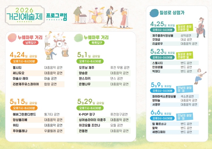 관광객이 많이 찾는 연동 누웨마루거리에서는 24일부터 오는 5월 29일까지 격주 금요일 오후 7시, 칠성로상점가에서는 25일부터 6월 6일까지 격주 토요일 오후 2시에 각각 공연이 이뤄진다.