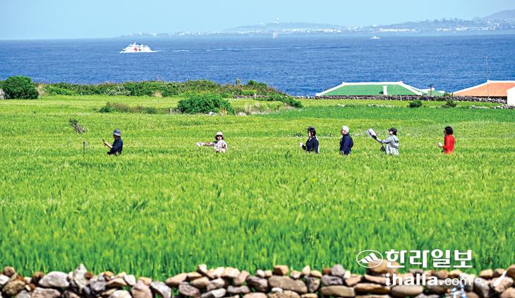 가파도 청보리밭 걷는 관광객들