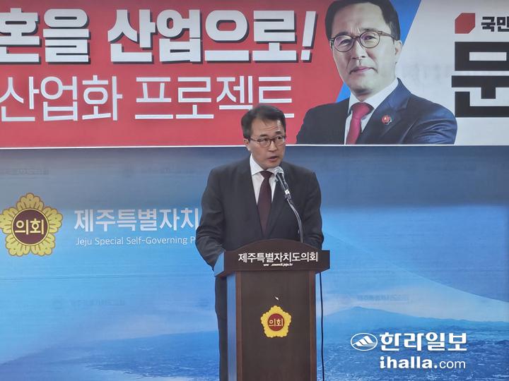 27일 제주도의회 도민카페에서 기자회견을 열고 있는 문성유 후보.