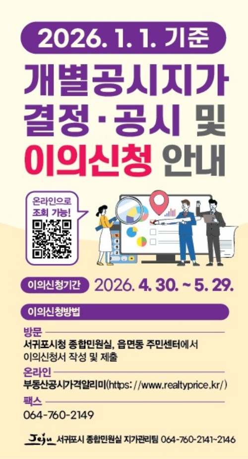 개별공시지가에 대한 이의신청도 30일부터 오는 5월 29일까지 이뤄진다. 신청자는 이의신청서를 작성해 부동산공시가격알리미를 통해 온라인으로 제출하거나, 서귀포시 종합민원실 및 읍·면·동 주민센터에 직접 방문 또는 팩스(064-760-2149)로 제출하면 된다.