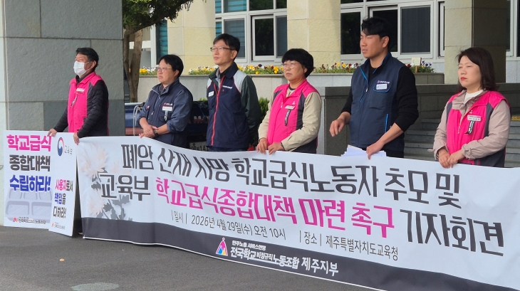 전국학교비정규직노동조합 제주지부(이하 학비노조 제주지부)는 29일 제주도교육청 앞에서 기자회견을 열고 폐암 산업재해로 사망한 학교급식노동자를 추모하며 이같이 요구했다.