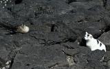 [한라일보] 18일 제주시 애월읍 금성리 해안 갯바위에서 휴식중인 흰뺨검둥오리를 배고픈 길고양이가 사냥을 하려는 장면이 포착됐다. 강희만기자 ■기사제보▷카카오톡 : '한라일보' 또는 '한…