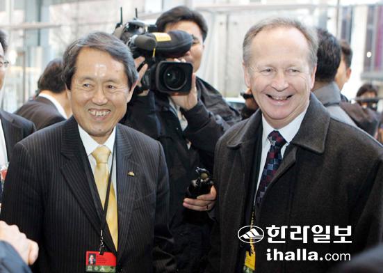 ▲김태환 도지사(왼쪽)가 26일 뉴질랜드현지에서 폴딩월 세계자연보전연맹 자문관과 담소를 나누며 환하게 웃고 있다. /사진=뉴질랜드 크라이스트처치에서강경민기자 gmkang@hallailbo.co.kr