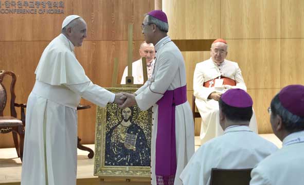 ▲교황이 지난 14일 서울 광진구 한국천주교중앙협의회를 방문, 베드로 무덤벽화의 모자이크화를 한국천주교 주교회의 의장인 강우일 주교에게 선물하고 있다. 연합뉴스