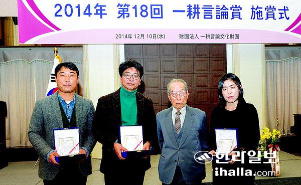10일 서울 한국프레스센터에서 열린 제18회 일경언론상 시상식에서 본지 '흑룡만리 제주밭담' 기획취재팀이 시상 후 기념촬영을 하고 있다. 사진 왼쪽부터 강경민 차장·강시영 부국장, 윤임술 일경언론문화재단 이사장, 김지은 기자. 부미현기자
