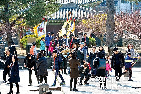 설 연휴인 지난 20일 중국인 크루즈 관광객들로 북적이는 시내면세점과 같은 날 제주외항 서방파제에서 중국의 하청여행사 가이드들로부터 안내를 받으며 크루즈에서 하선하고 있는 중국인 관광객들(사진 아래).