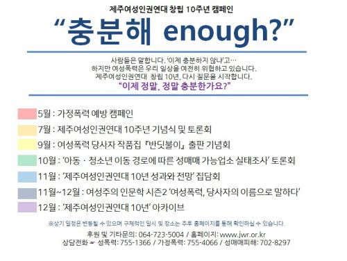 (사)제주여성인권연대는 창립 10주년을 맞아 '충분해 enough?'라는 캐치프레이즈를 내걸고 올 연말까지 '여성에 대한 폭력 근절'캠페인을 전개한다.