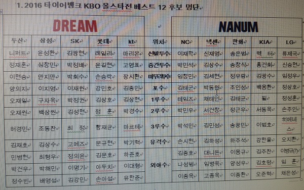 KBO 리그 10개 구단이 드림 올스타(두산, 삼성, SK, 롯데, kt)와 나눔 올스타(NC, 넥센, 한화, KIA, LG)로 나눠 펼치는 2016 KBO 올스타전은 오는 7월 16일(토) 서울 고척 스카이돔에서 개최되며, 각 구단으로부터 추천 받은 총 120명의 후보 중 드림, 나눔 각 팀 당 12명씩, 총 24명의 베스트 선수가 팬 투표와 선수단 투표를 통해 선정된다.