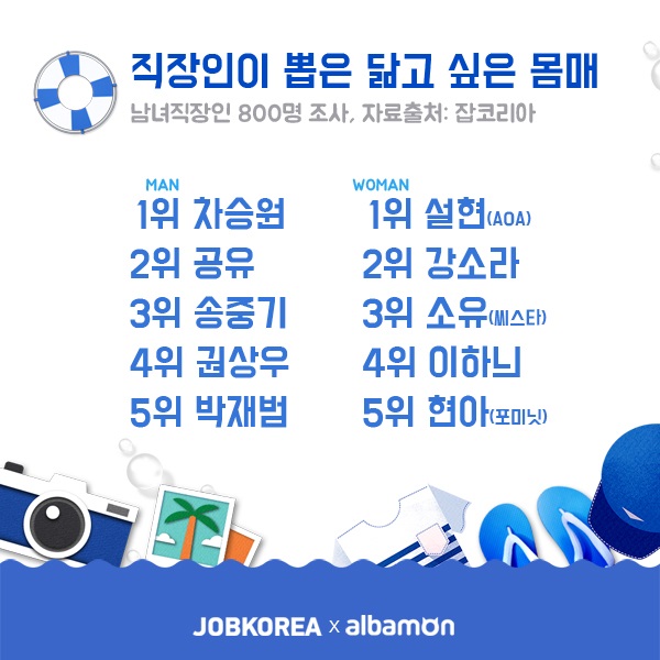 취업포털 잡코리아(www.jobkorea.co.kr)는 매년 여름 남녀 직장인을 대상으로 닮고 싶은 연예인 몸매 킹&퀸을 조사해왔다. 올해는 알바몬과 함께 남녀직장인 800명을 대상으로 닮고 싶은 연예인 몸매를 개방형으로 조사했다.