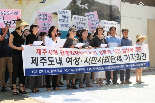 12일 제주도내 여성·시민사회단체는 제주시청 어울림마당에서 기자회견을 열고 여성 폭력 발생에 대한 사전 예방적 대책 마련을 제주도에 요구했다.
