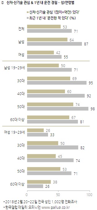신차·신기술 관심도 차이는 평소 운전 경험과도 관련 있어 보인다고 한국갤럽은 설명했다. 이번 조사에서 성인의 71%가 1년 내 운전 경험이 있는 것으로 파악됐다. 30~50대 남성은 1년 내 운전 경험률이 90%를 넘었으나 30~50대 여성은 70~80% 선이다.