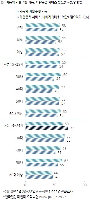 카셰어링·차량공유 서비스가 얼마나 필요한지 물은 결과 '매우 필요' 29%, '약간 필요' 25%, '별로 필요하지 않다' 19%, '전혀 필요하지 않다' 19%로 성인의 54%가 '필요하다', 38%는 '필요하지 않다'고 답했고 7%는 의견을 유보했다. 차량공유 서비스 필요성('매우+약간 필요하다' 응답 비율)은 20·30대 여성과 학생층에서 70% 내외로 높은 편이다.