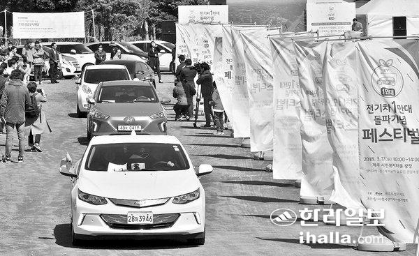 17일 제주시민복지타운 광장에서 '전기차 1만대 돌파 기념 페스티벌'이 열려 참석자들이 전기차를 타고 퍼레이드를 하고 있다. 강경민기자
