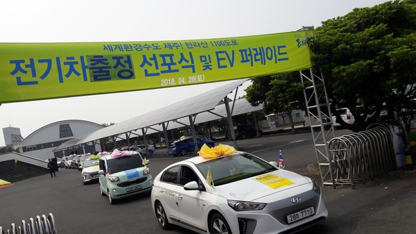 이에 앞서 4.28(토) 한라체육관에서는 오전10시 전기차 출정선포식을 시작으로 오후1시는 EV퍼레이드 행사가 있었다.