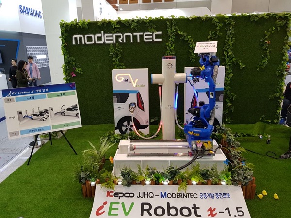 한전제주본부와 벤처기업인 (주)모던텍과 공동으로 개발, 공개한 충전로봇은 주차와 동시에 자동으로 충전케이블을 연결하고 충전해 전기차 이용자의 편의성와 안전성을 더욱 향상시킨 획기적인 제품이다. 지난 2월 한전제주본부에서 준공된 1:N 충전시스템인 iEV-Station과 결합해 충전로봇 1대로 최대 50대까지 자동충전 시킬 수 있도록 개발됐다.