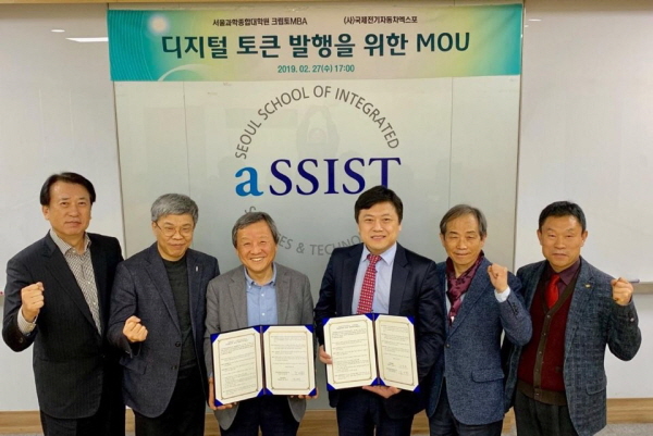 (사)국제전기자동차엑스포(이사장 김대환)는 서울과학종합대학원(aSSIST) 크립토 MBA(주임교수 김문수)와 지난달 27일 서울과학종합대학원에서 국제전기자동차엑스포 디지털 토큰 발행과 연구를 위한 상호협력 양해각서(MOU)를 체결했다.