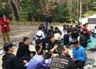 오름중학교 학생들이 16일 한라산둘레길에서 멧돼지가 먹이활동을 한 모습에 대해 김완병 박사의 이야기를 경청하고 있다.