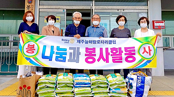 제주늘해랑로타리클럽(회장 이경렬)은 지난달 29일 제주시 봉개경로당 앞에서 백미 200㎏와 양말 266켤레를 제주사회복지공동모금회(회장 김남식)에 기탁했다. 이번 물품은 클럽에서 여름철 폭염으로 힘들어하는 노인가구를 위해 십시일반 마련한 것으로, 봉개경로당에 전달됐다.