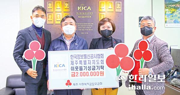 한국정보통신공사협회 제주특별차지도회(회장 강희석)는 최근 한국정보통신공사협회 제주도회 사무실에서 이웃사랑 성금 200만원을 제주사회복지공동모금회(회장 강지언)에 기탁했다. 이번 성금은 협회에서 연말연시 어려운 이웃들을 돕고자 마련한 것이다.