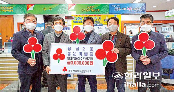 제주시 용담2동 흥운마을회(회장 유재호)는 지난 6일 용담2동주민센터에서 원예작품전 수익금 300만원을 제주사회복지공동모금회(회장 강지언)에 기부했다.