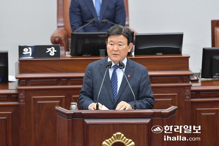 15일 김광수 제주도교육감이 제주도의회 본회의장에서 내년 새해 예산안 제출에 따른 시정연설을 하고 있다. 제주자치도의회 제공