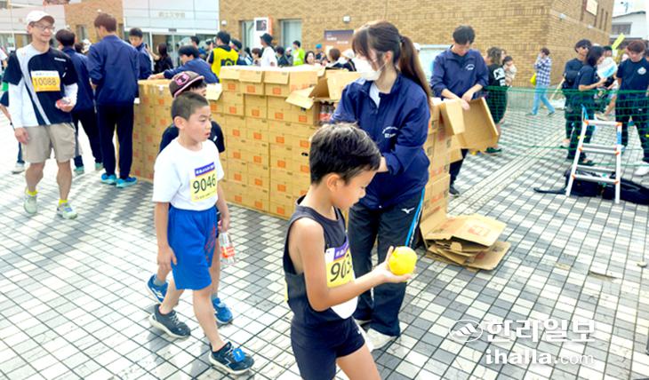 1위는 지난해 감귤마라톤에 초청받아 우승을 차지한 히라야마 아카네 씨로, 2시간45분의 기록으로 골인했다. 감귤과 애플마라톤을 석권하는 영예를 안았다.