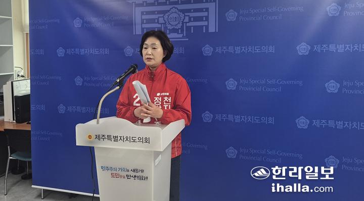 강하영 의원이 24일 제주도의회 도민카페에서 기자회견을 열고 있다. 김채현기자