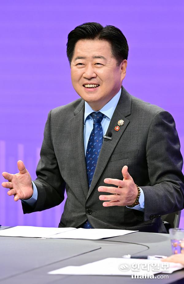 6·3 제주도지사 선거 재선에 도전하는 오영훈 제주지사가 24일 KCTV 제주방송 스튜디오에서 열린 '제주도지사 선거 예비주자 특별대담'에서 발언하고 있다. 특별대담은 한라일보와 KCTV제주방송, 삼다일보, 헤드라인제주가 공동 주최했다. 강희만 기자