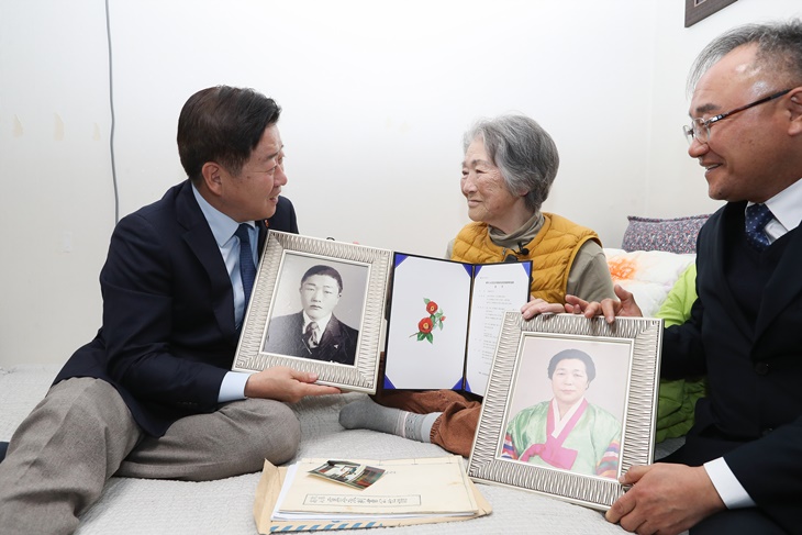 지난 2월 13일 '4·3 가족관계등록부 정정 결정문'을 고계순 할머니에게 전달한 오영훈 제주도지사와 김창범 제주4·3희생자유족회장. 제주도 제공
