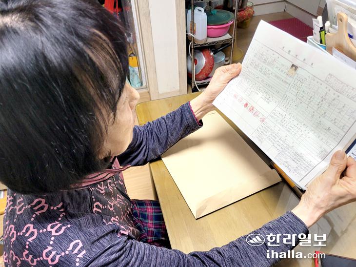 4·3 희생자 유족인 김정희 씨가 지난달 23일 제주시 애월읍 자택에서 뒤틀린 가족관계를 바로 잡기에 나서게 된 계기가 된 자신의 국민학교 생활기록부를 꺼내어 들여다보고 있다. 박소정기자