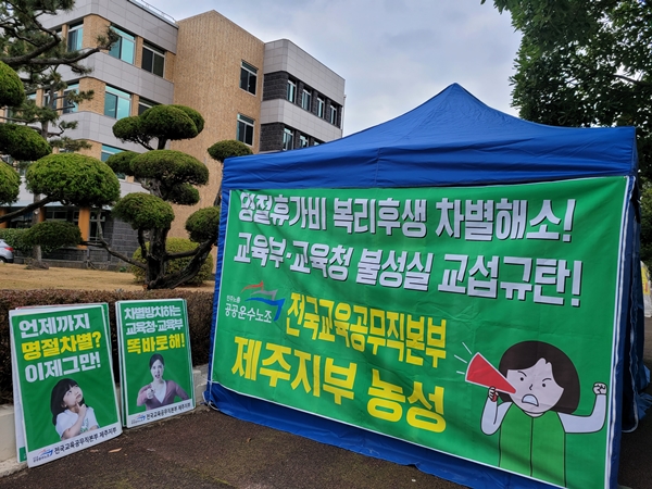 민주노총 공공운수노조 전국교육공무직본부 제주지부(이하 교육공무직 제주지부)는 30일 제주도교육청 앞에서 기자회견을 열고 "파업으로 내모는 집단교섭, 교육감이 해결하라"고 촉구하며 전국 시·도교육청 동기다발 무기한 …