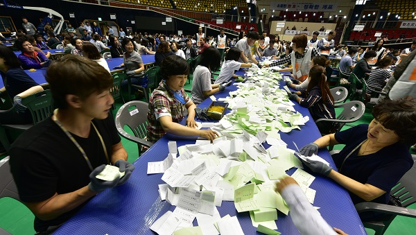 6·13지방선거 제주시 지역 개표 작업이 13일 오후 6시 25분쯤 제주시 한라체육관에서 이뤄지고 있는 가운데 다양한 종류의 무효표가 속출해 씁쓸한 웃음을 자아냈다.  제주도지사 선거 후보 5명 모두에게 투표한 용지가 있는가 …