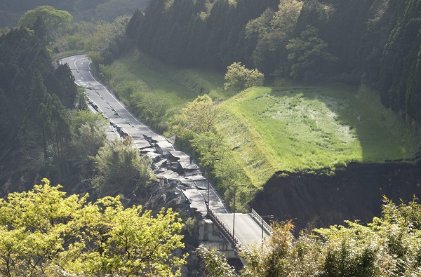 규모 6.5 지진 발생 후 17일 오후까지 사람이 느낄 수 있는 수준인 진도 1 이상의 지진이 470회 이상, 사람이 공포를 느낄 수 있는 수준인 진도 4 이상의 지진이 78회 발생하는 등 여진이 이어졌다. 사진은 이날 강진 피해 중심인 구마모토현 미나미아소의 산악 도로가 붕괴한 모습.