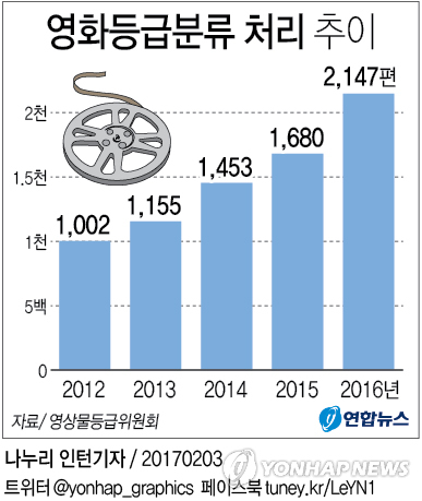 이는 2012년(1천2편) 등급분류 편수가 처음으로 1천 편을 넘은 이후 4년 만에 2배 이상 증가한 것이다.