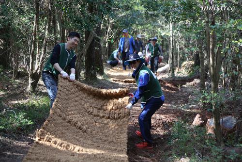 전국의 이니스프리 임직원과 경영주 등으로 구성된 이니스프리 그린원정대는 지난 4월 서귀포시 소재 물오름 등에서 탐방로에 친환경 식생 매트인 야자수 매트를 설치하는 등 다양한 자원봉사활동을 펼치고 있다.