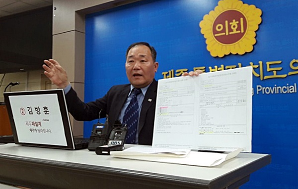 자유한국당 김방훈 제주도지사 선거 예비후보 측은 과거 문대림 예비후보의 친척이 저지른 수산 보조금 비리 사건에 문 예비후보가 개입한 것으로 의심된다고 14일 주장했다.