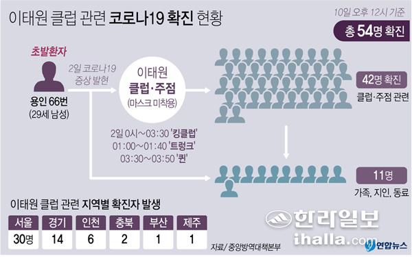 10일 낮 12시 기준으로 서울 이태원 클럽 관련 신종 코로나바이러스 감염증(코로나19) 확진자는 총 54명으로 집계됐다.