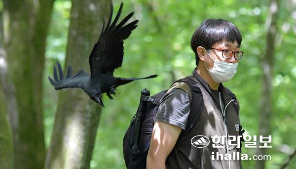 제주시 조천읍 교래리 사려니숲 탐방로에서 까마귀가 탐방객을 공격하고 있다. 강희만기자