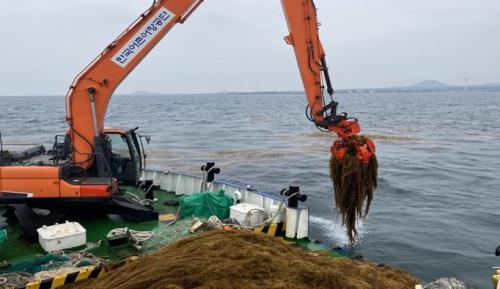 5월 13일부터 시작된 중국발 괭생이모자반 수거작업이 한달째 이어지는 가운데 제주시 지역에서만 4200t이 수거됐다. 사진=제주시 제공