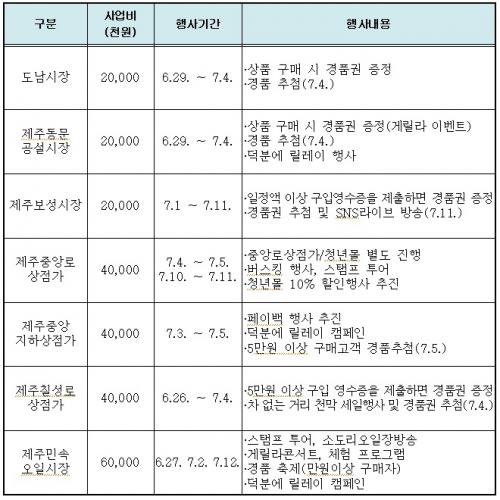 이번 동행세일은 지난 3월 공고된 중소벤처기업부의 2020년 전통시장 및 상점가 활성화 추경사업 공모사업에 전통시장과 상점가 7곳(도남·동문공설·보성시장, 제주민속오일시장, 중앙로상점가, 칠성로상점가, 중앙지하상가)이 선정되면서 사업비를 전액 지원받아 진행된다.