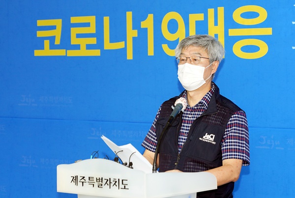 배종면 제주도 감염병관리지원단장이 21일 제주도청 기자실에서 26번 확진자의 동선을 공개하고 있다. 사진=제주도 제공