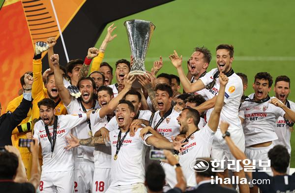 트로피 들고 기뻐하는 세비야 선수들. 연합뉴스