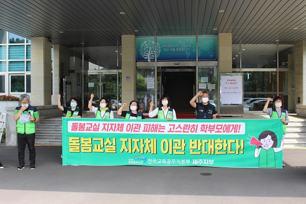 민주노총 공공운수노조 전국교육공무직본부 제주지부는 10일 제주도교육청 앞에서 기자회견을 열고 "교육부와 교육청이 돌봄교실을 책임져야 한다"고 촉구했다.